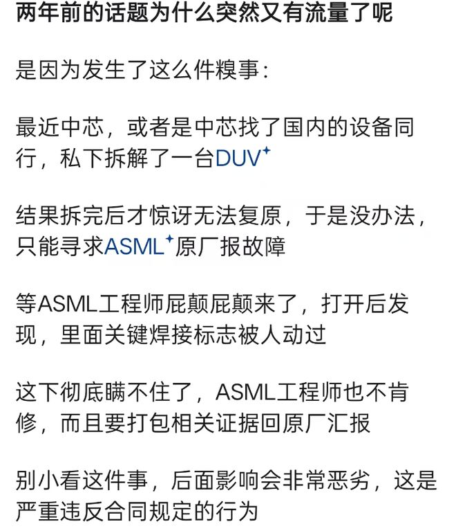 这个人做某件事的时候,他认为,如果他知道某件事,他就能做,如果他不知道,他就做不到。当你知道他不知道时,不要假装你知道该怎么做。有句话说,坏主意和愚蠢的主意一样好。这真是太尴尬了。但我们中芯国际却做了这么丢人的事。他们做了他们明确承诺不做的事情,但他们却做错了,并引发了很多问题。这就是他们毁掉的。当然,这个话题之所以如此火爆,是因为中芯国际需要测试其光刻机。对此,有网友发现了这一点。有媒体专门提到了此事。有网友看完上述报道后指出,中芯国际实际上是明知甲方不允许而犯罪。更重要的是,尽管他们知道这在技术上是不可能的,但他们还是这么做了。而且他也不清楚情况。需要注意的是,中意并未考虑供应链问题特快专递。可以说,中芯国际完全无视这些客观条件,强行拆除曝光设备,目的是发展逆分解。然而,他失败了,寇发现了他的意图。 The consequences should be very serious. In fact, Party A will not tolerate SMIC's move.学习别人的技能然后毁掉他们的作品是残酷的。这就像学了别人的技术,然后把人从辣改成粥或汤一样。即使你不说好话,至少也应该遵守你的商业合同。既然签订了合同,就必须按照合同的规定办事。你不能签署一份合同,得到一些东西,然后反悔并做出一些小动作。长此以往,商业互信只会减弱。我一直认为人做事应该有一个起码的标准,不应该以正义或高尚的名义肆无忌惮地做任何事情目标。这很容易导致你一次又一次冲过终点线,让其他人感到不舒服。从这个角度来看,中芯国际突然的想法不仅对中芯国际本身造成严重后果,也可能损害其他同行。